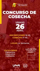 En el marco de la tradicional Fiesta Provincial y Nacional del Algodón, se realizará una nueva edición del Concurso de Cosecha Manual de Algodón, una actividad que celebra el esfuerzo, la tradición y la identidad de nuestra comunidad algodonera.