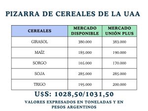 Compartimos los precios de la pizarra de cereales de la Unión Agrícola de Avellaneda, con valores actualizados al cierre del día de la fecha: